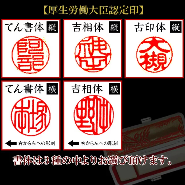 人気の彫刻書体は、認印ですので、古印体・てん書体・吉相体が多いです。認印として使うなら、古印体の縦彫りが人気です。