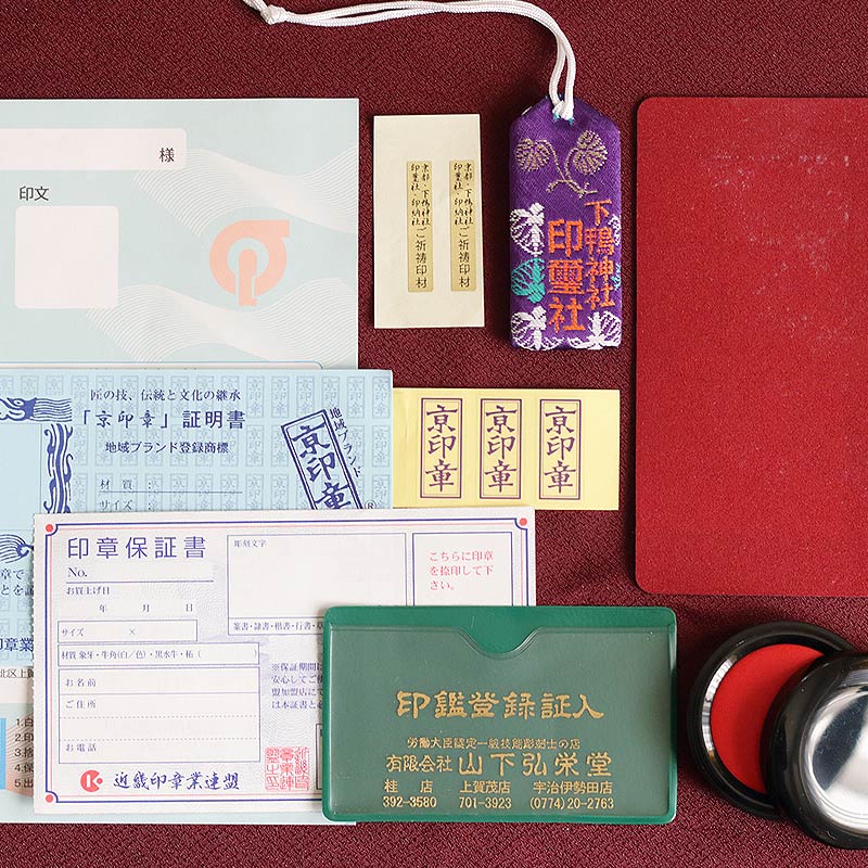 - 12mm×60mm印鑑、印鑑ケース、桐箱、印鑑彫刻証明書、印鑑保証書、正規御祈祷認定証・シール、下鴨神社御祈祷お守り、和包装、別彫証明シール、捺印マット、印鑑朱肉