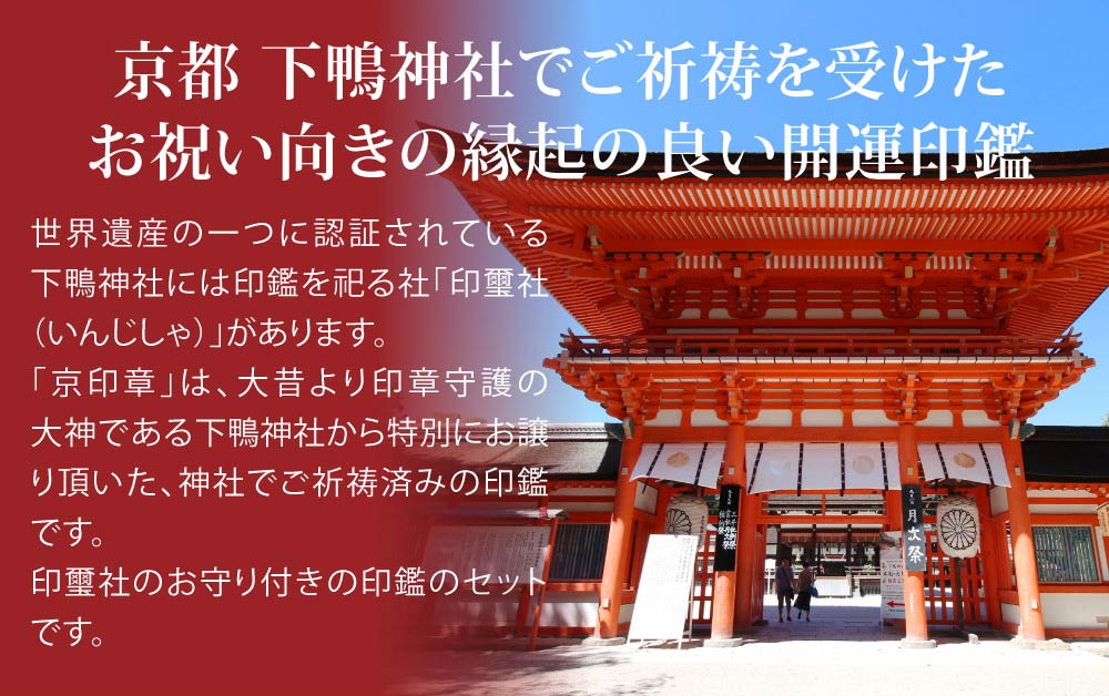 - 15mm×60mm印鑑、印鑑ケース、桐箱、印鑑彫刻証明書、印鑑保証書、正規御祈祷認定証・シール、下鴨神社御祈祷お守り、和包装、別彫証明シール、捺印マット、印鑑朱肉
