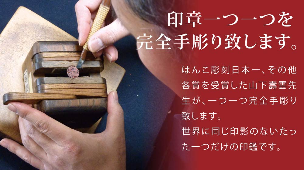 熟練した彫刻職人の山下壽雲が、念入りにお客様のご希望を考慮し、文字のバランスなどを考えて、人生が豊かになるように祈願・念じて「一刻一魂 心を込めて」お客様に喜んで頂けるように彫刻致します。