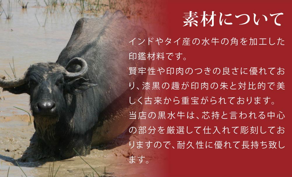 - 下鴨神社祈願済みの黒水牛印材を現代の名工が彫刻する黒水牛認印です。