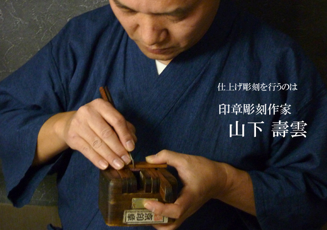 熟練した彫刻職人の山下壽雲が、念入りにお客様のご希望を考慮し、文字のバランスなどを考えて、人生が豊かになるように祈願・念じて「一刻一魂 心を込めて」お客様に喜んで頂けるように彫刻致します。